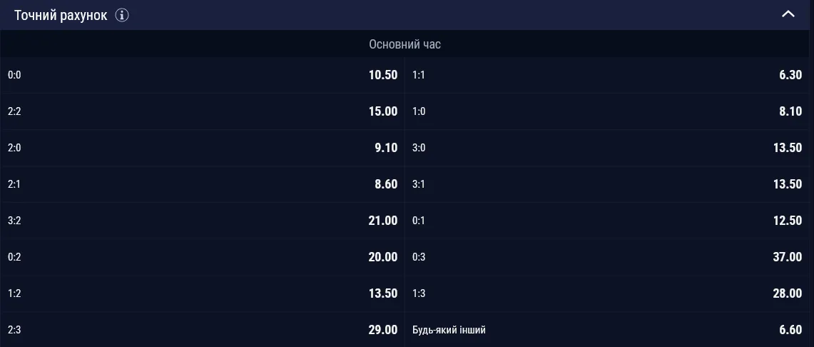 Водночас найімовірнішим рахунком вважається 1:1 – для нього діє коефіцієнт 6.30. А крім того: